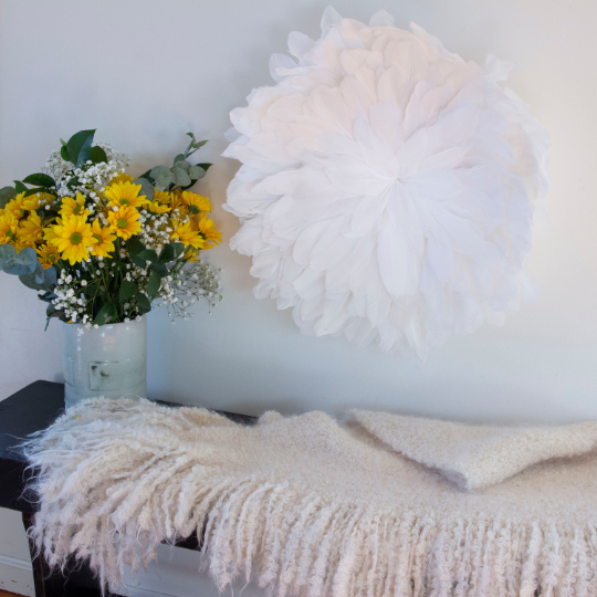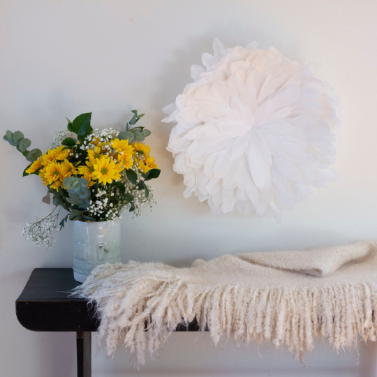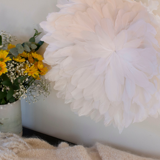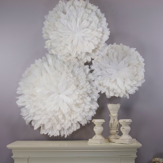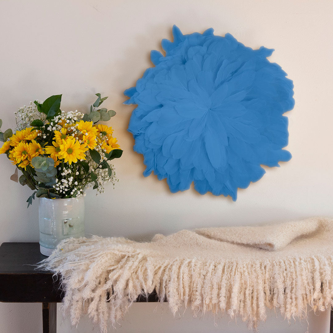 Express your unique style with these Small Feather Medallion Wall Art And Décor Accents. These handmade Feather Medallions are made with Dyed 5-6" Goose Pallet Feathers that have been arranged on a 11.5" diameter Jute & Wood Base. Choose from a variety of colors to match your lifestyle and space. The overall dimensions measure 18"-22" in diameter and has a sawtooth hanger on the back to make it easy to hang as decorative wall art. Decorate with eco friendly decor, perfect for the Modern or Bohemian home, these feather accents compliment any wall space or table setting. Pair them together or showcase them separately for a stunning display of natural beauty.