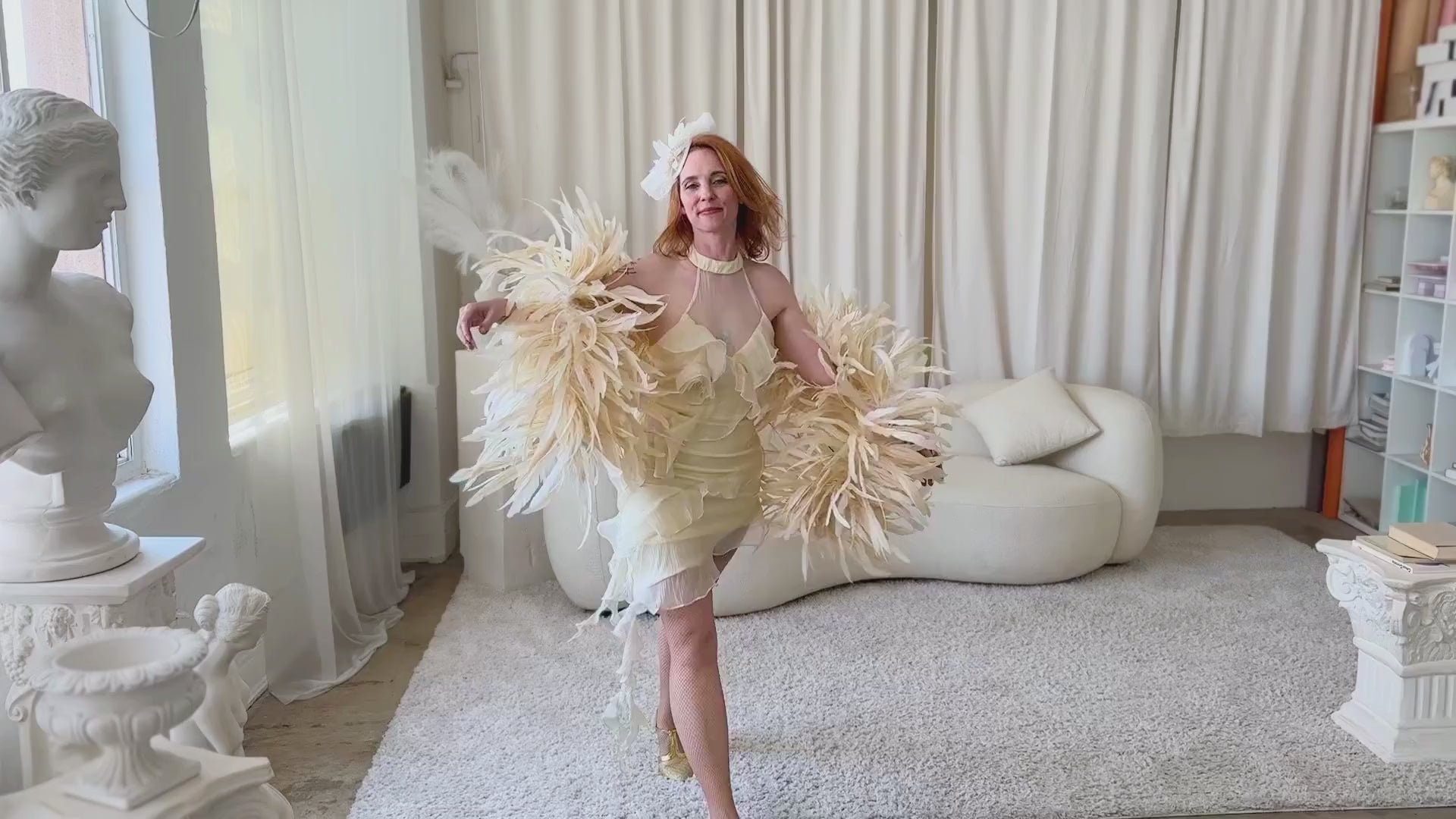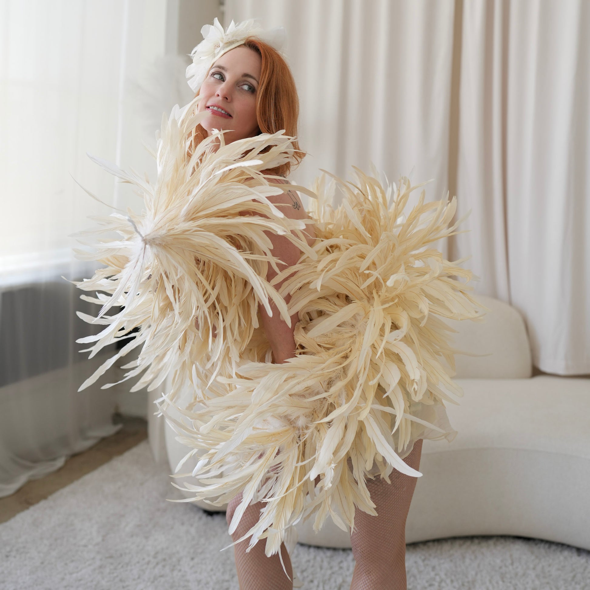 Add a Touch of Glamour with our Deluxe Rooster Coque Tail Feather Boa! This luxurious feather boa is the perfect accessory to elevate any look. Ideal for burlesque performances, ballroom dancing, photography, fashion and costume design, or any special occasion, it brings drama, elegance, and flair wherever you go. Whether you're stepping into the spotlight or adding a bold accent to your ensemble, this boa delivers timeless sophistication with every sway. These luxurious feather boas measure 2 yards (6 feet) in length and are crafted from 10-12" bleach-dyed rooster coque tail feathers...making it approximately 20-24" inches in diameter.