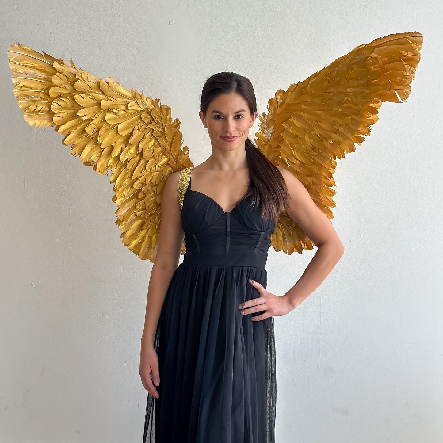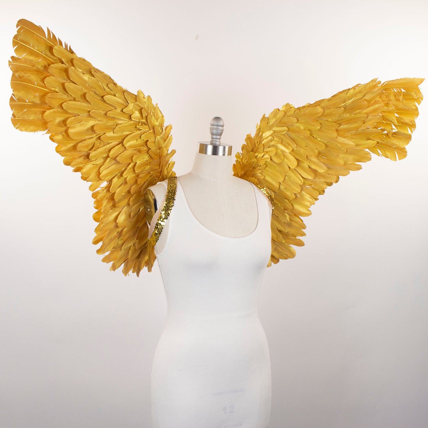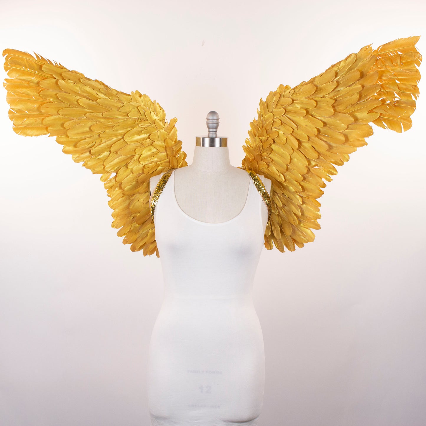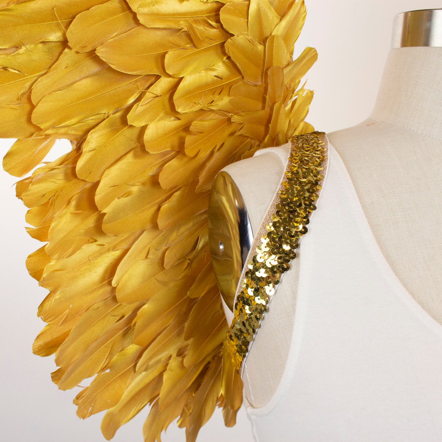 Our extra large Metallic Gold Feathered Angel Wings are gilded with metallic paint. These elegant feather wings will take your costume to the next level. Made with high-quality materials that ensure durability and comfort, these sexy angel wings with its striking design is sure to make you feel like a true celestial being. Available in Gold with soft short pile faux fur backing and Gold Sequin Elastic Straps. Approximate Size 48" wide x 28" tall when fully open. As this is a handmade item, treat with care.