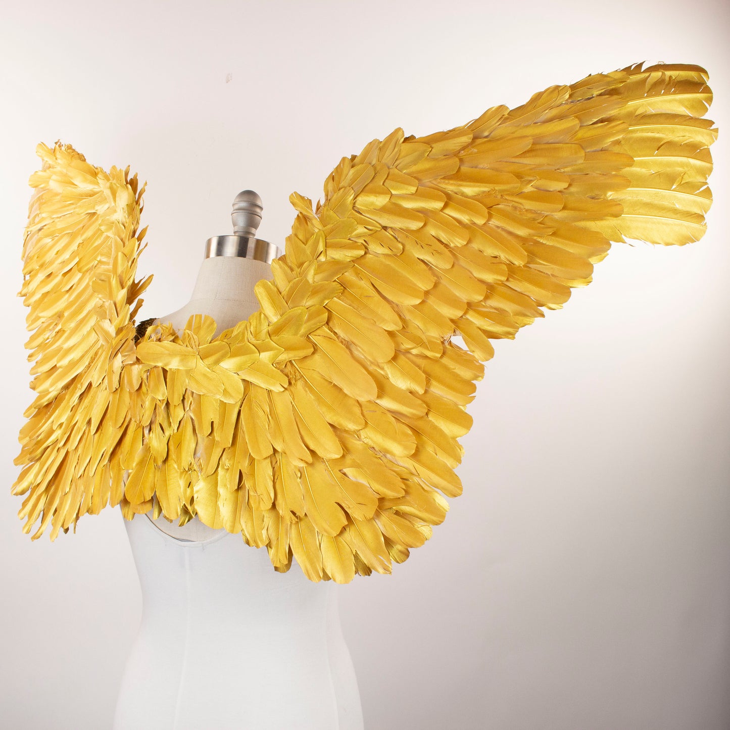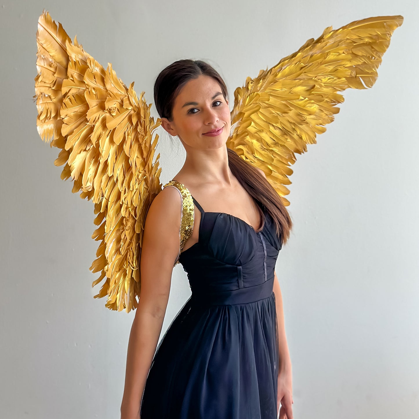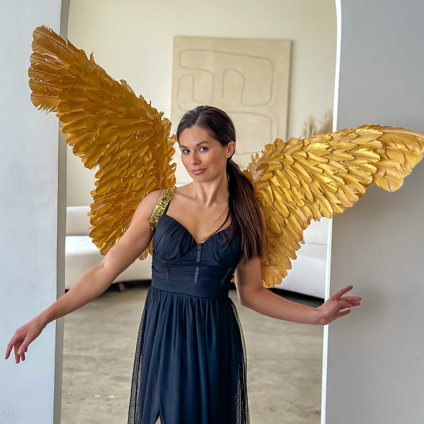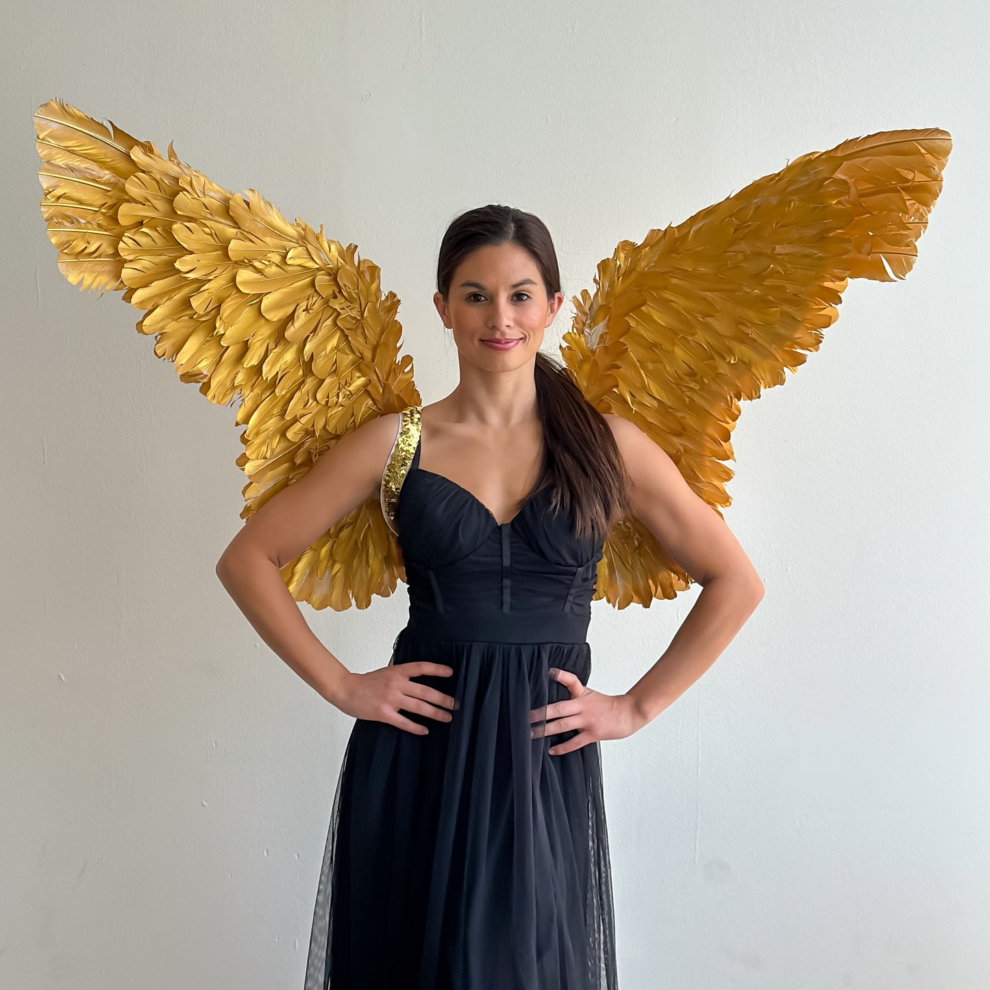 Our extra large Metallic Gold Feathered Angel Wings are gilded with metallic paint. These elegant feather wings will take your costume to the next level. Made with high-quality materials that ensure durability and comfort, these sexy angel wings with its striking design is sure to make you feel like a true celestial being. Available in Gold with soft short pile faux fur backing and Gold Sequin Elastic Straps. Approximate Size 48" wide x 28" tall when fully open. As this is a handmade item, treat with care.