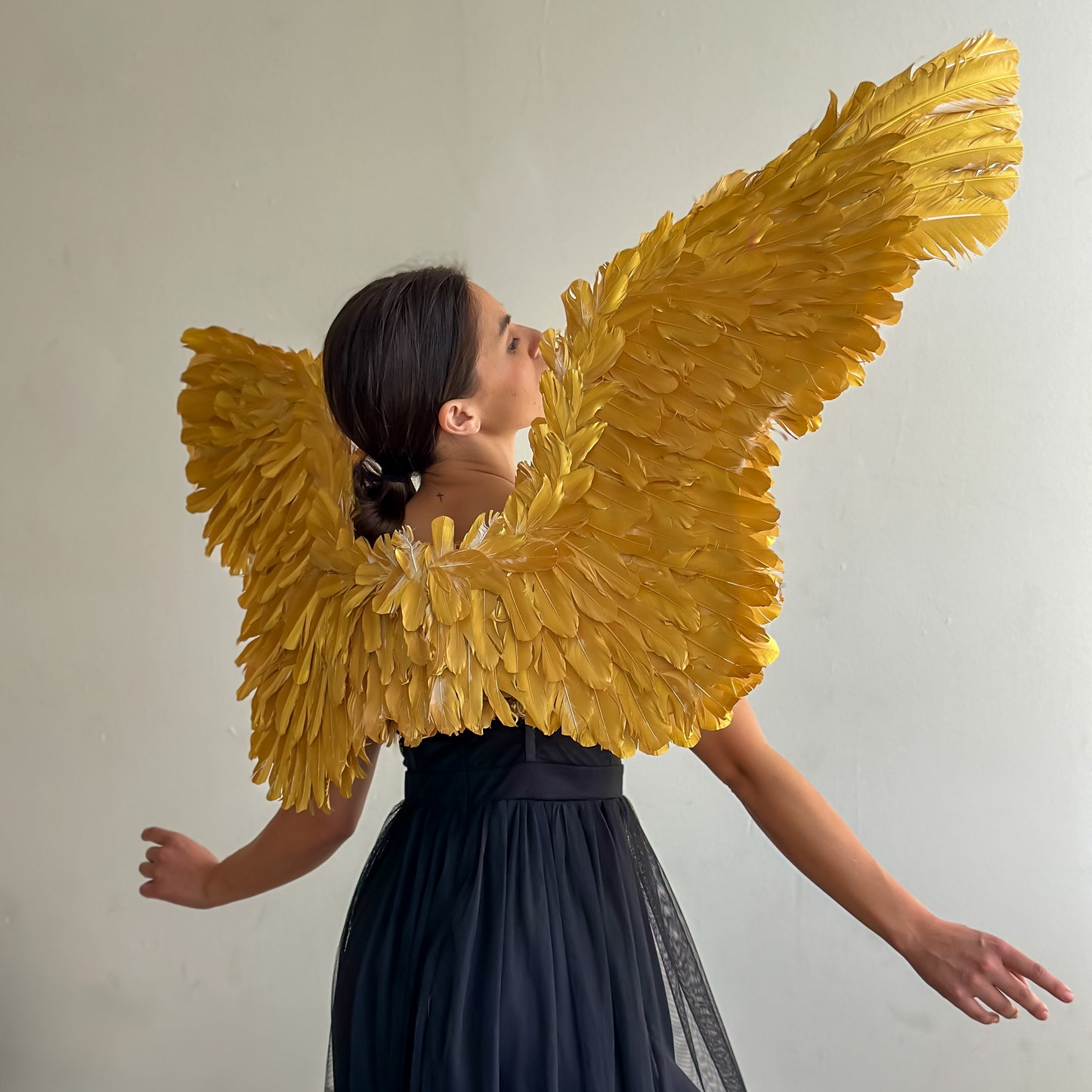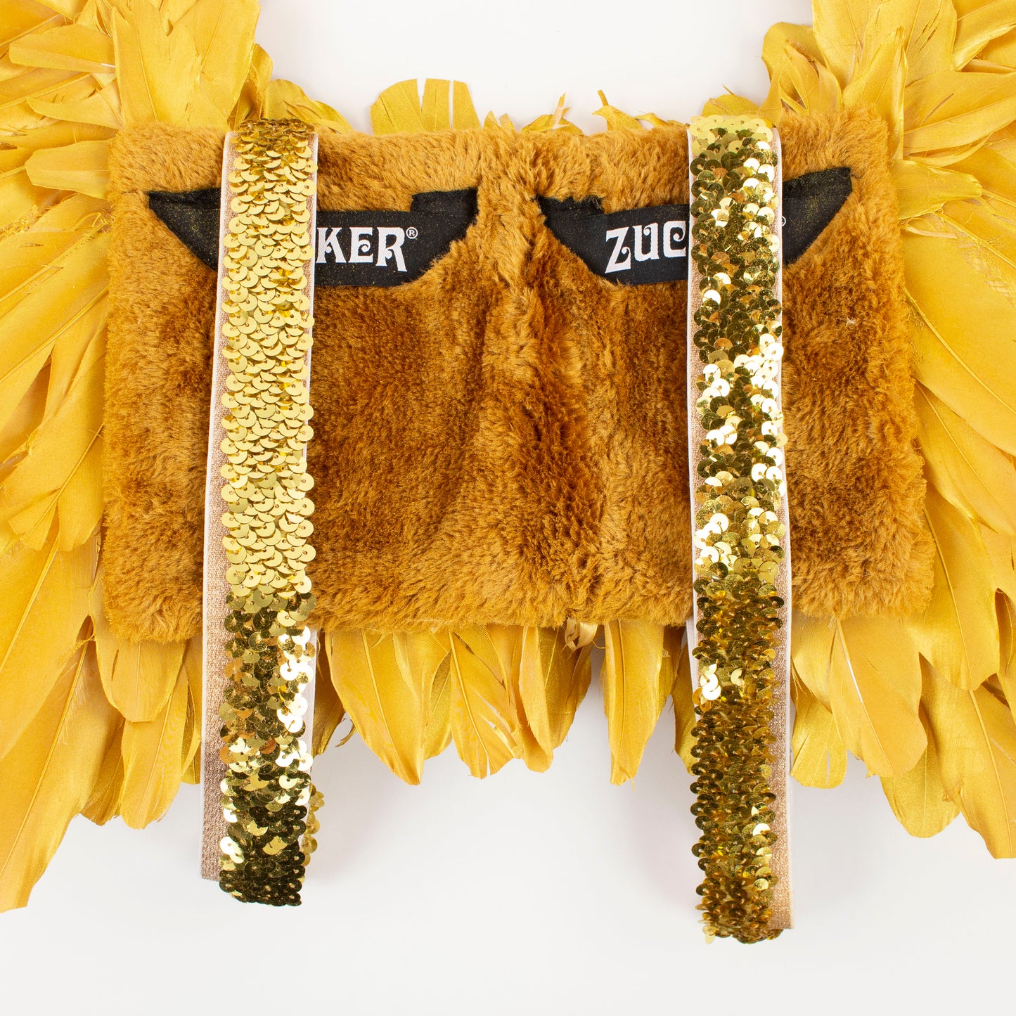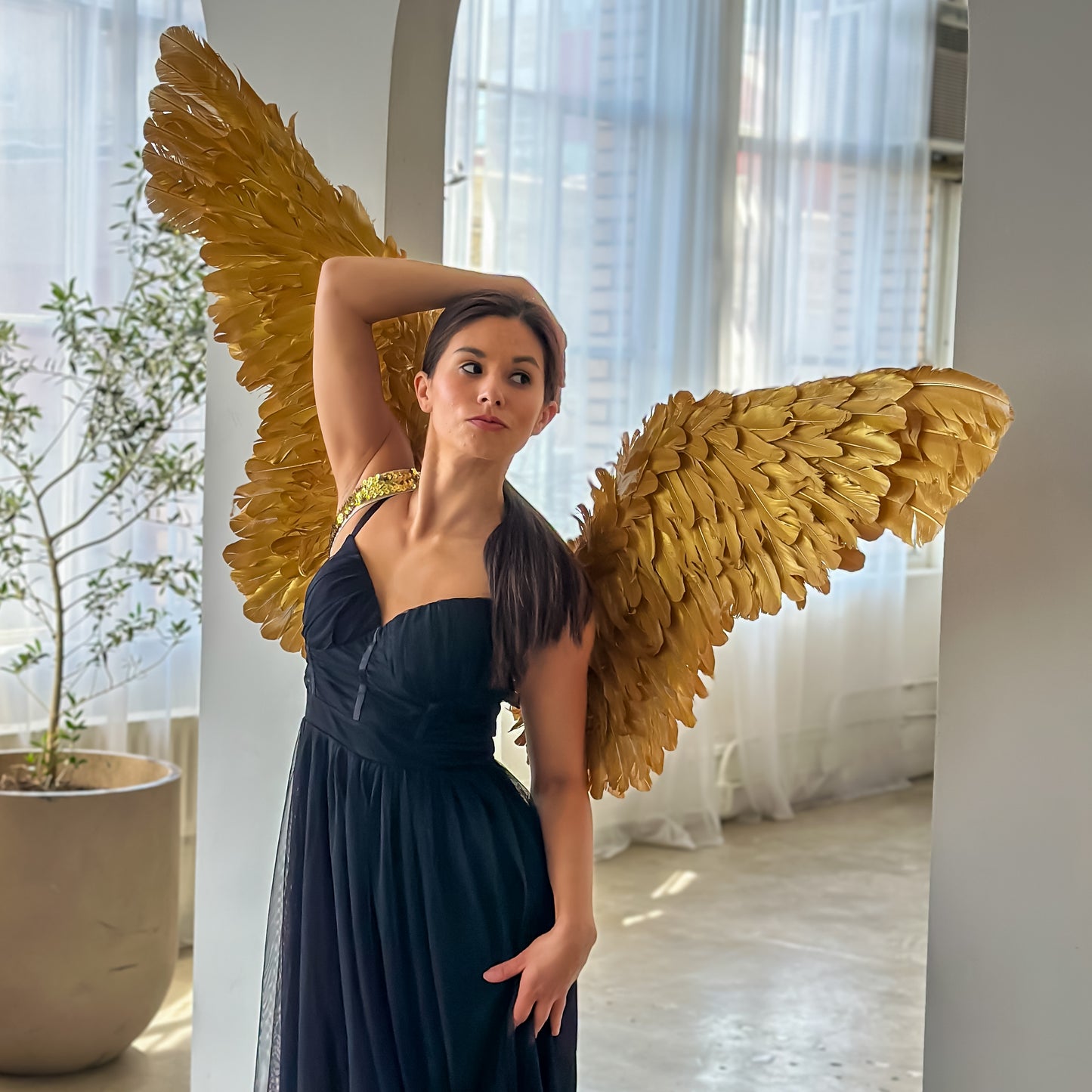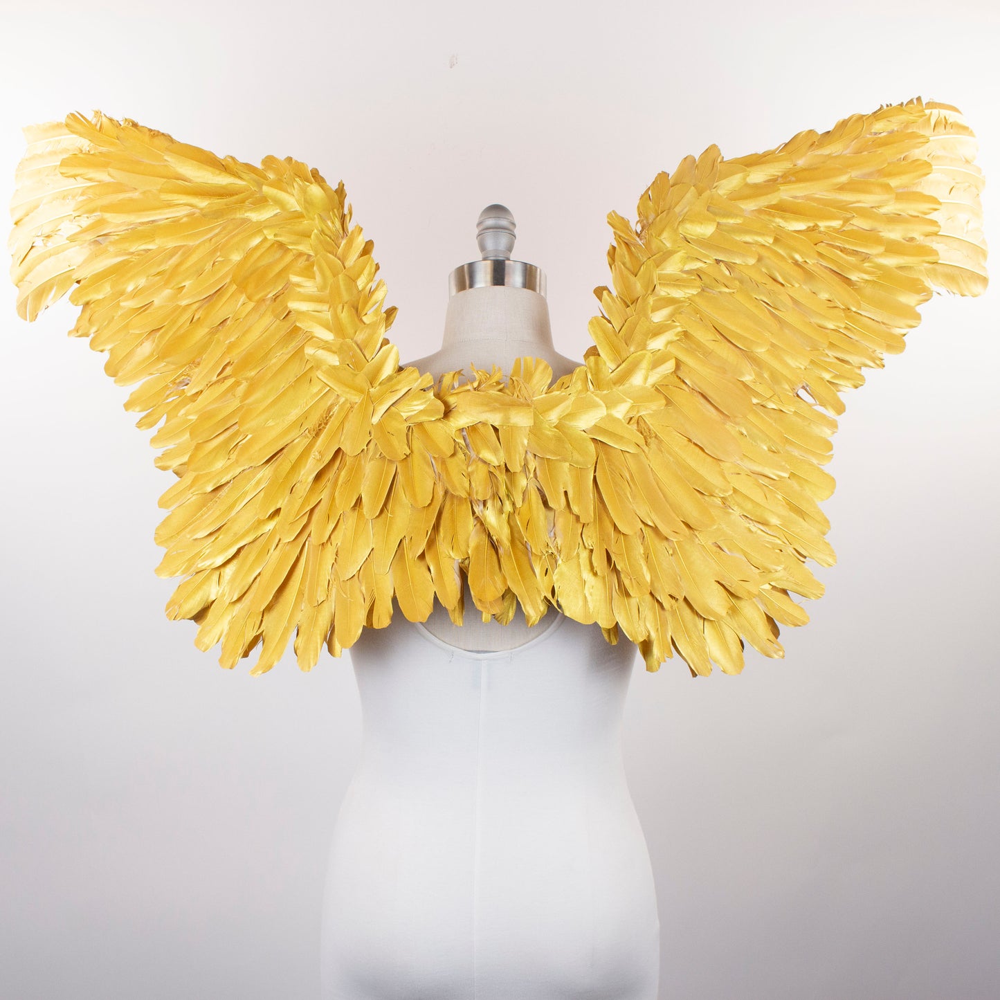 Our extra large Metallic Gold Feathered Angel Wings are gilded with metallic paint. These elegant feather wings will take your costume to the next level. Made with high-quality materials that ensure durability and comfort, these sexy angel wings with its striking design is sure to make you feel like a true celestial being. Available in Gold with soft short pile faux fur backing and Gold Sequin Elastic Straps. Approximate Size 48" wide x 28" tall when fully open. As this is a handmade item, treat with care.