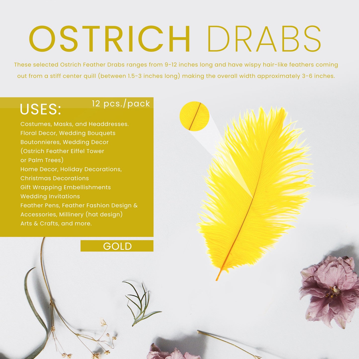 Ostrich Drabs are approximately 9-12" long. The 1 piece and 12 piece packages are hand selected. The 1/4 lb ostrich feathers bulk contain approximately 100 pieces, non-selected.