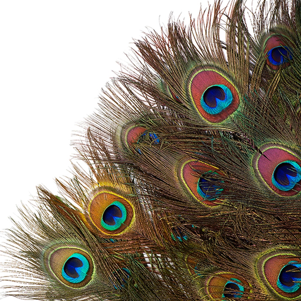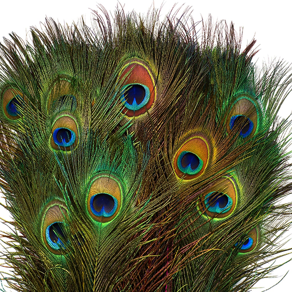Stem Dyed Peacock Tail Feathers with Full Eyes 30-40 inches long are treated with dyes that stain the entire quill (stem), and amplify the natural iridescent hues of the peacock feathers. The width of the full eyes including the surrounding hair-like flue will range 1.5-4.5 inches. Although treated with dye, the original amber, green, purple, and blue colors of the peacock eye remain visible.